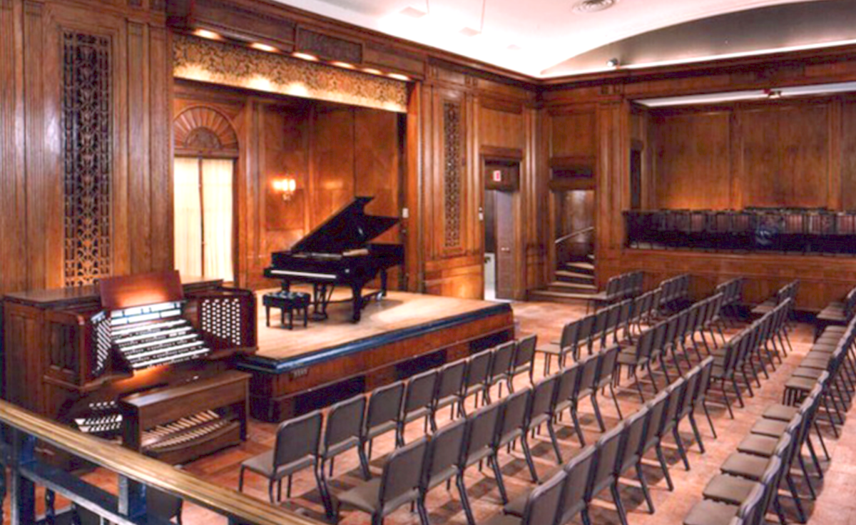 "Campus and Facilities" で見てみると、"Field Concert Hall" という名前で、240席のホール。コンサートやマスタークラスや録音で使われているようだ。小さなオルガン(5-manual, 116-rank Aeolian-Skinner organ)も設置されている。